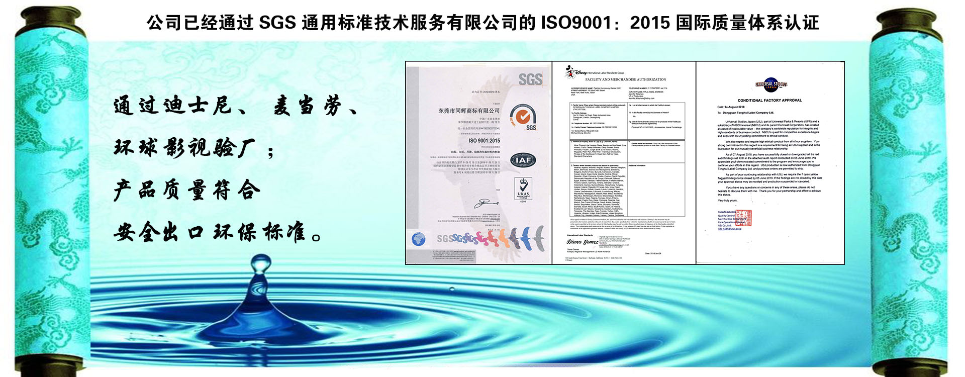 東莞市同輝商標輔料及包裝印刷有限公司是一家專業從事商標制造、包裝印刷的企業,主營生產和銷售:各類織嘜商標,織章,印刷商標,印嘜,標簽印刷,不干膠商標,絲印商標,熱轉印標,無感商標,燙嘜,皮牌商標,電壓商標、商標帶、繡花標,布貼標、皮貼標、商標吊牌,彩卡,折盒等廣泛用于各行各業。工廠經過多年的發(fā)展與開拓,規(guī)模日益發(fā)展壯大。從設計制作、工程研發(fā)、生產制造、產后加工、品檢、物流配送、售后服務等一套完整的優(yōu)質服務體系,及優(yōu)秀的經營管理團隊。已通過SGS ISO9001:2008(新版是2015版)國際質量體系認證,產品質量符合各國安全出口環(huán)保標準。承蒙國內外客戶的大力支持,目前已有許多國際著名品牌定點授權我公司生產,并是通過全球迪士尼FAMA認證驗廠,麥當勞驗廠,環(huán)球影視驗廠的供應商,是各行業值得信賴并具有實力的合作伙伴。